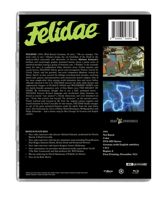 FELIDAE (1994, Wild Bunch Germany, 82 min.). “Oh no, stranger. The dead come to me,” whispers Jesaja, the cat Guardian of the Dead in the skeleton-filled catacombs and labyrinths of director Michael Schaack’s brilliant and surprisingly graphic animated feature about a grisly series of unsolved murders among a group of domestic cats. (“Felidae” is the scientific name for cats.) A combination feline detective story, Gothic mystery and occult horror, FELIDAE follows green-eyed protagonist Francis (voiced by Ulrich Tukur) and his grizzled, one-eyed companion Blaubart (voiced by Mario Adorf) as they unravel the killings stretching back decades, involving death cults, genetic experimentation and a mysterious martyr religion. One of the most sought-after titles among world animation fans and never before officially released in the U.S., FELIDAE marries the dark, adult themes and nightmarish imagery of PLAGUE DOGS and WATERSHIP DOWN with the family-friendly animation style of Don Bluth circa THE SECRET OF NIMH. Be forewarned, though: this is not a kids’ animated movie – FELIDAE features R-rated language and cat-themed slang (humans are dissed as merely “can openers”), bloody dissections and even simulated cat sex. “Truly this activity was beyond The Aristocats”, as the narrator purrs. Newly scanned and restored in 4K from the original camera negative and sound elements by Deaf Crocodile for this release, FELIDAE finally emerges as one of the great animated features made for adults from the past thirty years. Also featuring the voices of