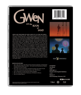 GWEN AND THE BOOK OF SAND (GWEN ET LE LIVRE DE SABLE) – 1985, La Traverse Films, 64 min. “Why search the sand for answers? It has told us everything,” whispers Roseline (voiced by Michel Robin), the 173-year old desert nomad narrator of French director Jean-François Laguionie’s hauntingly poetic animated feature of life after the apocalypse, where the few hardy survivors walk on stilts from well to well, scorpions glow like lanterns, and the mysterious Makou drops giant everyday objects – forks, eyeglasses, bathtubs – from the skies. Into this desolate science-fiction landscape, part-DUNE, part-FURY ROAD, emerges the story’s teenage heroine, Gwen (voiced by Lorella Di Cicco), who refuses to stay silent and hide in the shadows – and whose love for teenage boy Nokmoon, kidnapped by the Makou and its followers, will drive her and Roseline on an epic journey across the endless sands, “the still silence of chaos and oblivion.” A sublime and breathtaking masterpiece of world animation, painted in remarkable gouache images, GWEN… is on par with René Laloux’s FANTASTIC PLANET, Hayao Miyazaki’s NAUSICAÄ OF THE VALLEY OF THE WIND and Mamoru Oshii’s ANGEL’S EGG as a visually stunning and truly otherworldly experience, interwoven with surreal and dreamlike moments: a pillow fight in the desert; phantom projections of red UFOs in the night sky; a mystery cult who worship an ancient product catalog and sing gorgeous hymns to fireworks and a watering can made of galvanized steel. Beautifully restored in 4K with the director’s participation for La Traverse Films in France and released for the first time ever in the U.S. by Deaf Crocodile. In French with English subtitles.