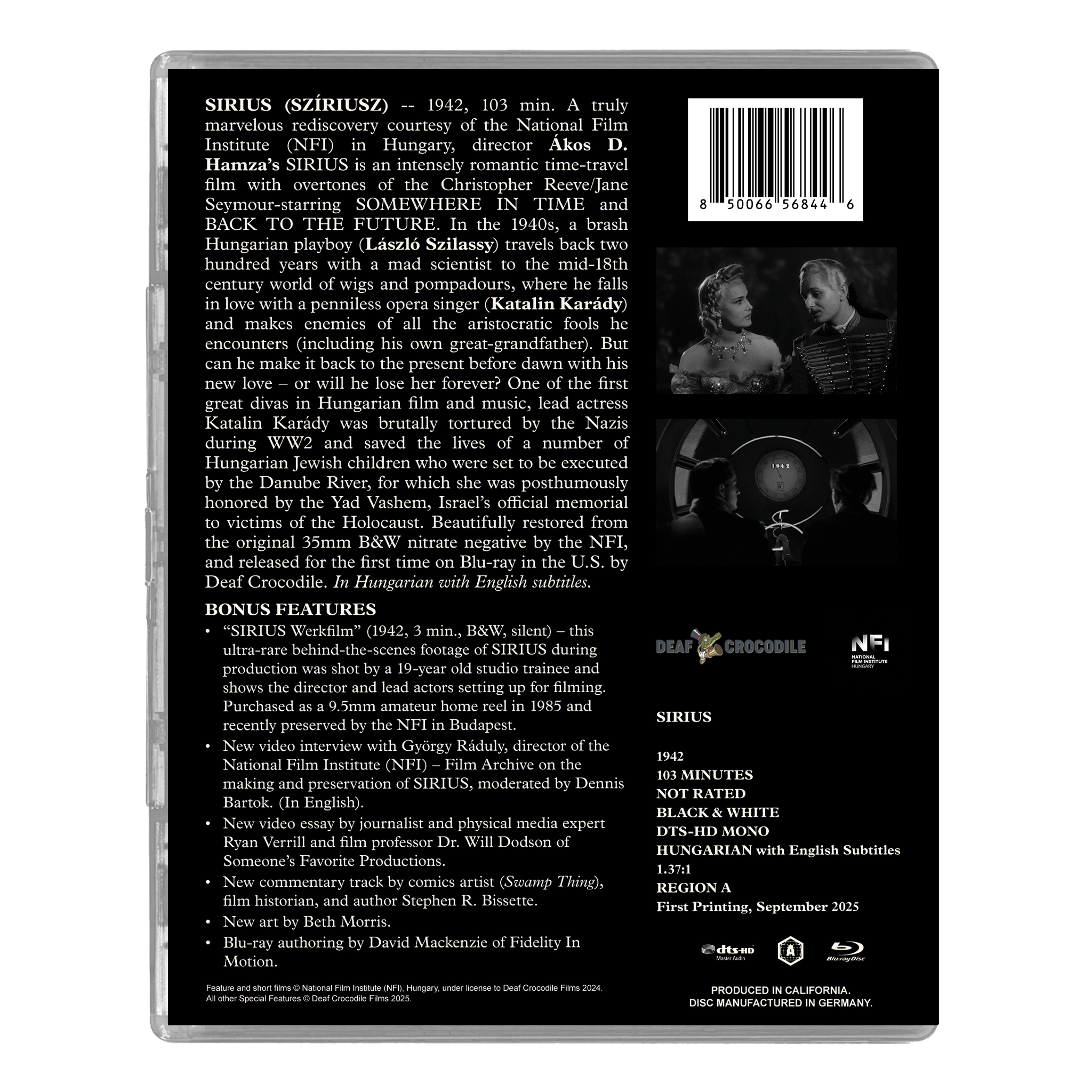 SIRIUS (SZÍRIUSZ) -- 1942, 103 min. A truly marvelous rediscovery courtesy of the National Film Institute (NFI) in Hungary, director Ákos D. Hamza’s SIRIUS is an intensely romantic time-travel film with overtones of the Christopher Reeve/Jane Seymour-starring SOMEWHERE IN TIME and BACK TO THE FUTURE. In the 1940s, a brash Hungarian playboy (László Szilassy) travels back two hundred years with a mad scientist to the mid-18th century world of wigs and pompadours, where he falls in love with a penniless opera singer (Katalin Karády) and makes enemies of all the aristocratic fools he encounters (including his own great-grandfather). But can he make it back to the present before dawn with his new love – or will he lose her forever? One of the first great divas in Hungarian film and music, lead actress Katalin Karády was brutally tortured by the Nazis during WW2 and saved the lives of a number of Hungarian Jewish children who were set to be executed by the Danube River, for which she was posthumously honored by the Yad Vashem, Israel’s official memorial to victims of the Holocaust. Beautifully restored from the original 35mm B&W nitrate negative by the NFI, and released for the first time on Blu-ray in the U.S. by Deaf Crocodile. In Hungarian with English subtitles.