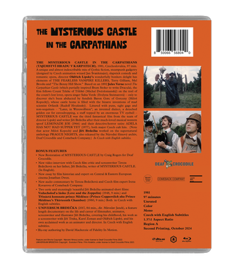 THE MYSTERIOUS CASTLE IN THE CARPATHIANS (TAJEMSTVÍ HRADU V KARPATECH), 1981, Czechoslovakia, 97 min. A unique and almost indescribable mix of Gothic fiction, steampunk gadgetry (designed by Czech animation wizard Jan Švankmajer), slapstick comedy and romantic opera, director Oldřich Lipský’s wonderfully bonkers delight has elements of THE FEARLESS VAMPIRE KILLERS, Terry Gilliam, Mel Brooks and “The Benny Hill Show.” Based on an 1892 Jules Verne novel The Carpathian Castle (which partially inspired Bram Stoker to write Dracula), the film follows Count Teleke of Tölökö (Michal Dočolomanský) on the trail of the count’s lost lover, opera singer Salsa Verde (Evelyna Steimarová) – only to discover she’s been abducted by fiendish Baron Gorc of Gorceny (Miloš Kopecký), whose castle home is filled with the bizarre inventions of mad scientist Orfanik (Rudolf Hrušínský). Littered with puns, sight gags and non-sequiturs – “Later, in Werewolfston”, an invented dialect, a detached golden ear for eavesdropping, a staff topped by an enormous TV eyeball – MYSTERIOUS CASTLE was the third fantastical film from the team of director Lipský and writer Jiří Brdečka after their much-loved musical western spoof LEMONADE JOE (1966) and their detective/horror satire ADELA HAS NOT HAD SUPPER YET (1977), both major Czech cult hits. (Note that actor Miloš Kopecký and Jiří Brdečka worked on the supernatural anthology PRAGUE NIGHTS, also released by the Národní filmový archív, Deaf Crocodile and Comeback Company.) In Czech with English subtitles.