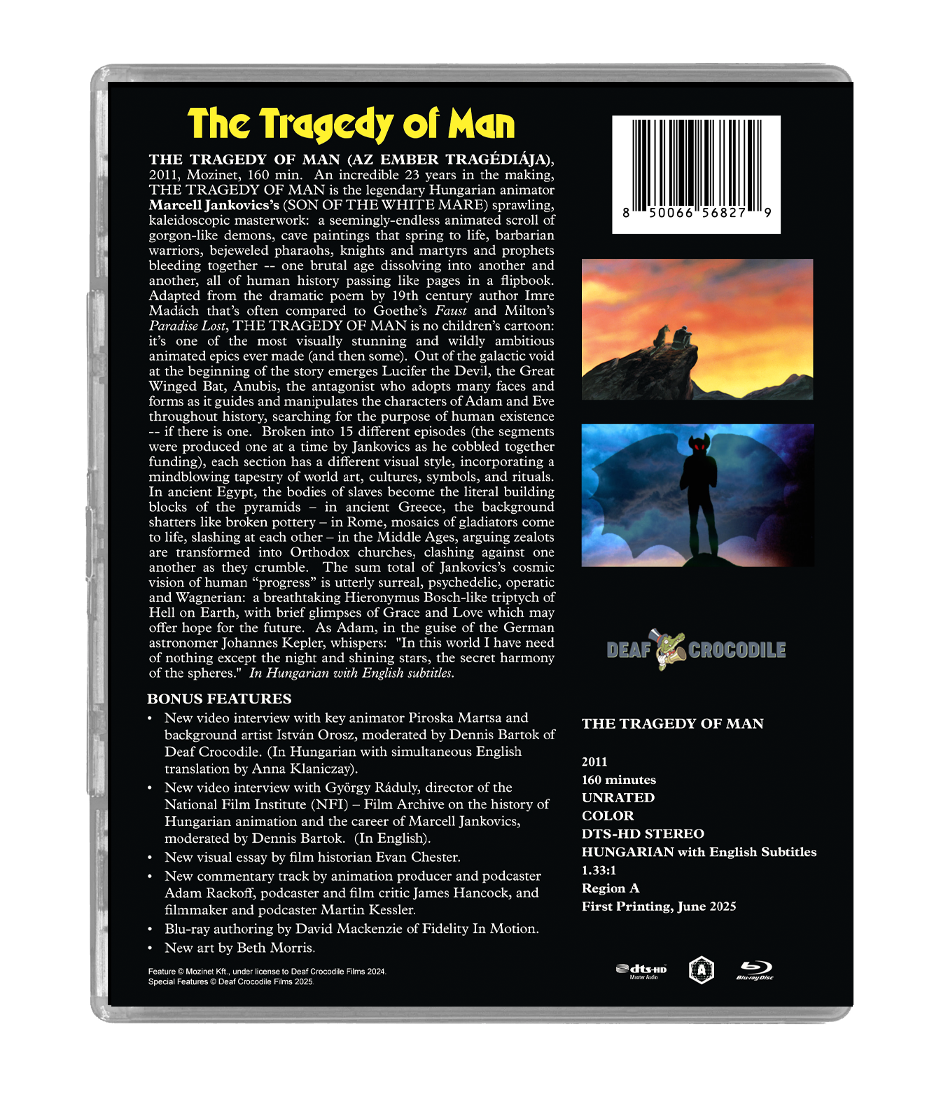 THE TRAGEDY OF MAN (AZ EMBER TRAGÉDIÁJA), 2011, Mozinet, 160 min. An incredible 23 years in the making, THE TRAGEDY OF MAN is the legendary Hungarian animator Marcell Jankovics’s (SON OF THE WHITE MARE) sprawling, kaleidoscopic masterwork: a seemingly-endless animated scroll of gorgon-like demons, cave paintings that spring to life, barbarian warriors, bejeweled pharaohs, knights and martyrs and prophets bleeding together -- one brutal age dissolving into another and another, all of human history passing like pages in a flipbook. Adapted from the dramatic poem by 19th century author Imre Madách that’s often compared to Goethe’s Faust and Milton’s Paradise Lost, THE TRAGEDY OF MAN is no children’s cartoon: it’s one of the most visually stunning and wildly ambitious animated epics ever made (and then some). Out of the galactic void at the beginning of the story emerges Lucifer the Devil, the Great Winged Bat, Anubis, the antagonist who adopts many faces and forms as it guides and manipulates the characters of Adam and Eve throughout history, searching for the purpose of human existence -- if there is one. Broken into 15 different episodes (the segments were produced one at a time by Jankovics as he cobbled together funding), each section has a different visual style, incorporating a mindblowing tapestry of world art, cultures, symbols, and rituals. In ancient Egypt, the bodies of slaves become the literal building blocks of the pyramids – in ancient Greece, the background shatters like broken pottery – in Rome, mosaics of gladiators come to life, slashing at each other – in the Middle Ages, arguing zealots are transformed into Orthodox churches, clashing against one another as they crumble. The sum total of Jankovics’s cosmic vision of human “progress” is utterly surreal, psychedelic, operatic and Wagnerian: a breathtaking Hieronymus Bosch-like triptych of Hell on Earth, with brief glimpses of Grace and Love which may offer hope for the future. As Adam, in the guise of the German astronomer Johannes Kepler, whispers: "In this world I have need of nothing except the night and shining stars, the secret harmony of the spheres." In Hungarian with English subtitles.