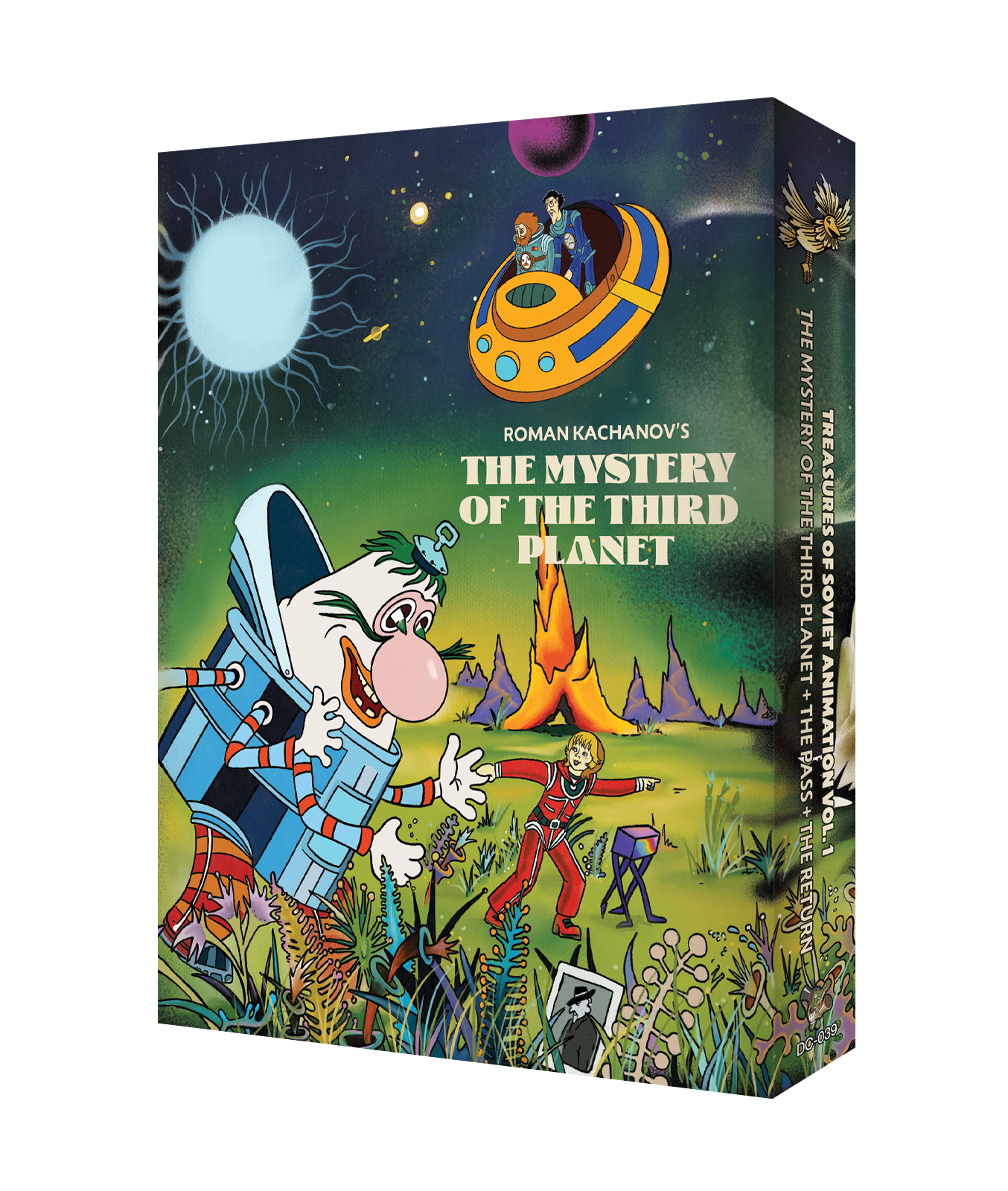 THE MYSTERY OF THE THIRD PLANET (TAYNA TRETEY PLANETY), 1981, Soyuzmultfilm, 48 min. Dir. Roman Kachanov. A trio of intrepid space explorers, Professor Seleznyov, his 9-year old daughter Alisa and the hilariously doom-and-gloom Captain Zelyonyy set off on a rocket ship in the year 2181 to collect rare alien creatures for the Moscow Zoo. They’re immediately drawn into an amazingly convoluted mystery involving a sinister doctor named Verkhovtsev, a nearly-extinct Chatter-bird, and two legendary missing cosmonauts, while galaxy hopping from one wildly colorful planet to the next. A delirious cosmic treat for fans of FANTASTIC PLANET and DELTA SPACE MISSION, MYSTERY… features a gallery of psychedelic space creatures straight out of YELLOW SUBMARINE. Based on “Alisa’s Voyage” by famed sci-fi author Kir Bulychev, Kachanov’s long sought-after gem packs enough plot, surreal imagery, and otherworldly worlds into its 48 minutes for an entire mini-series. In Russian with English subtitles.
